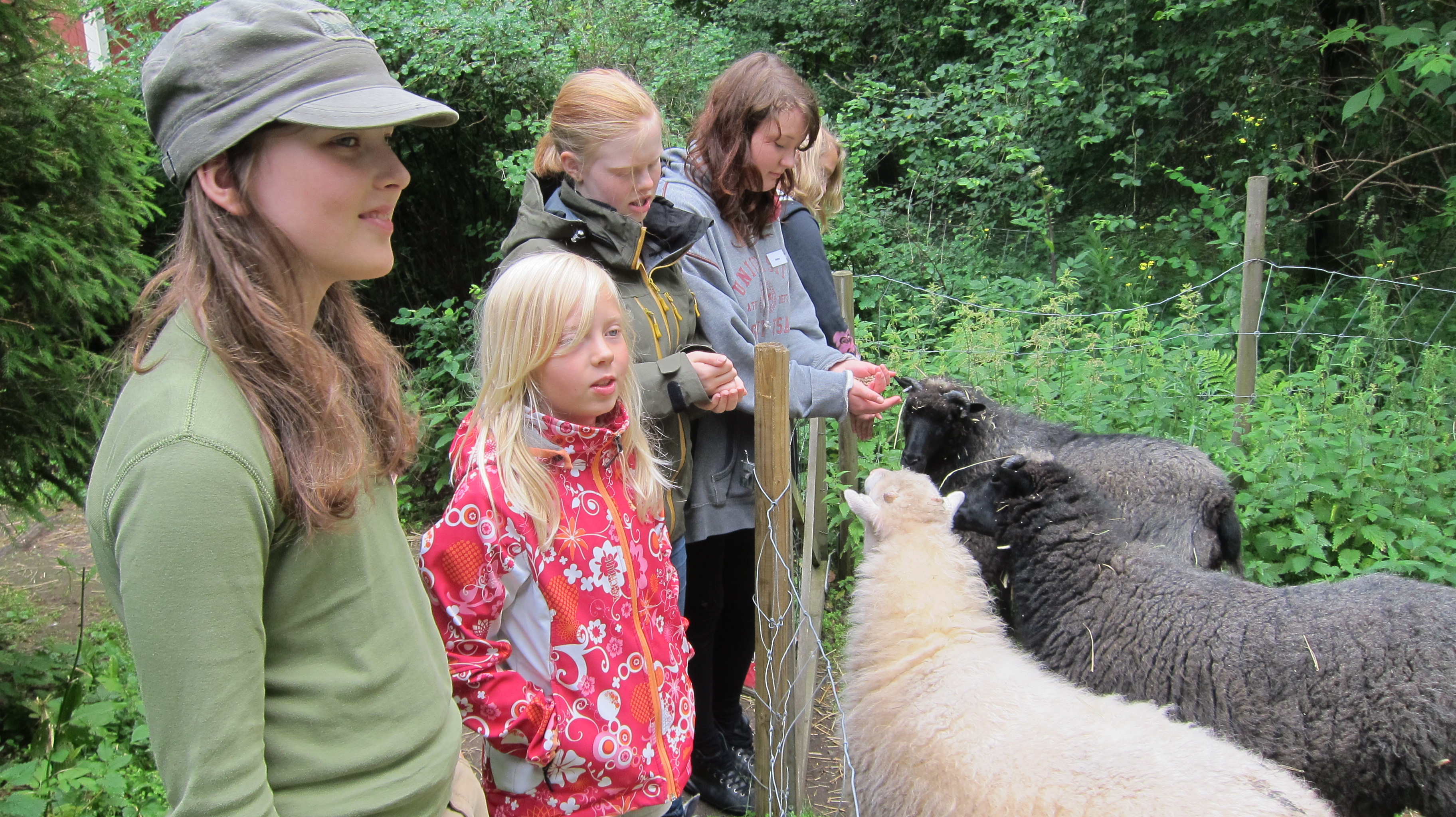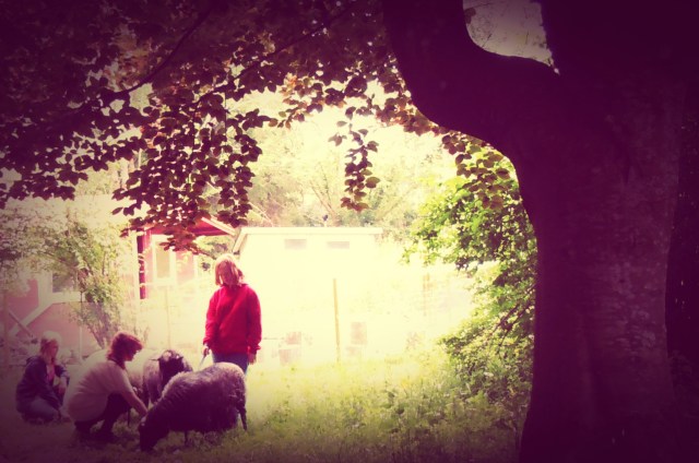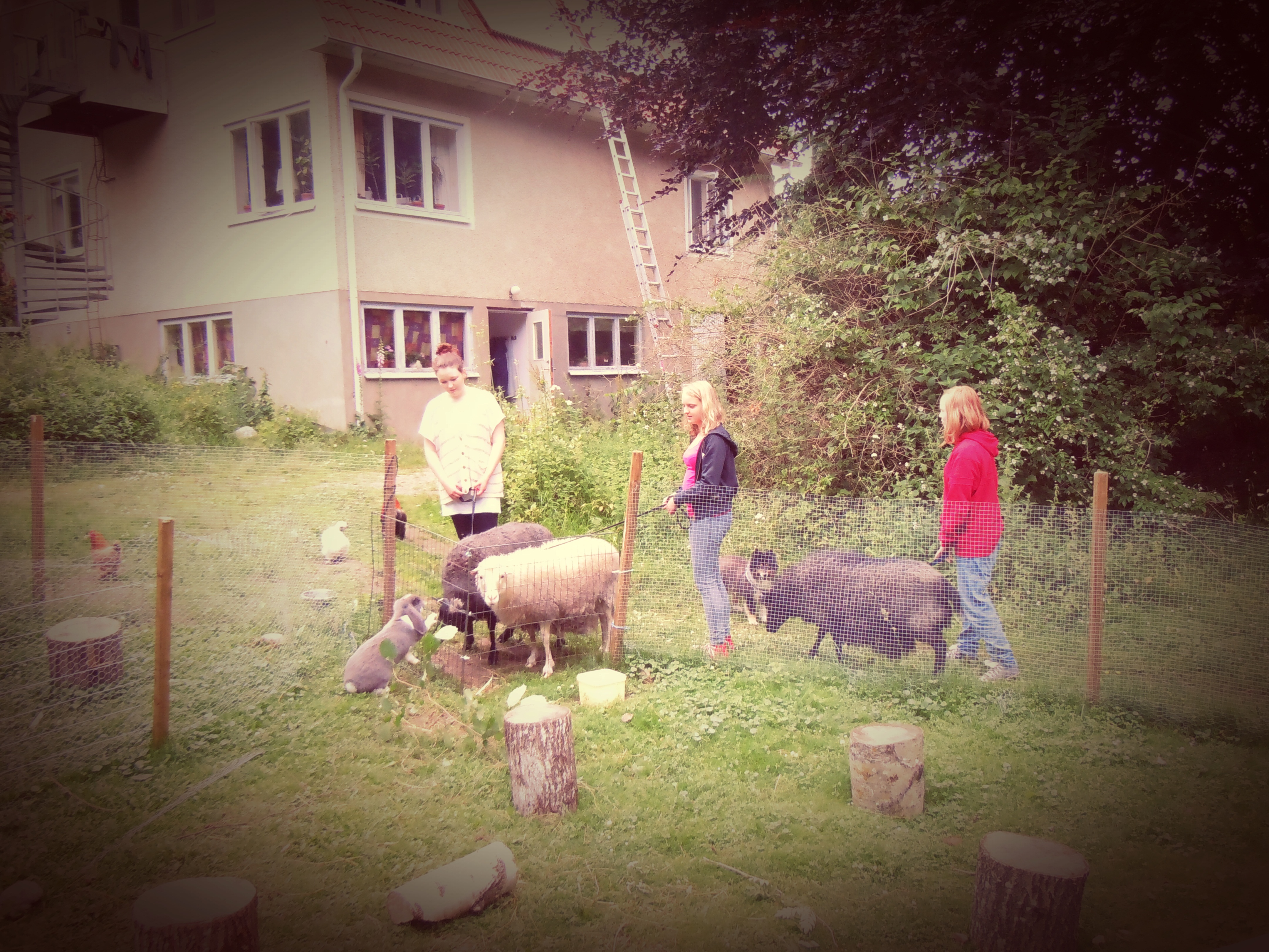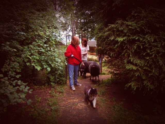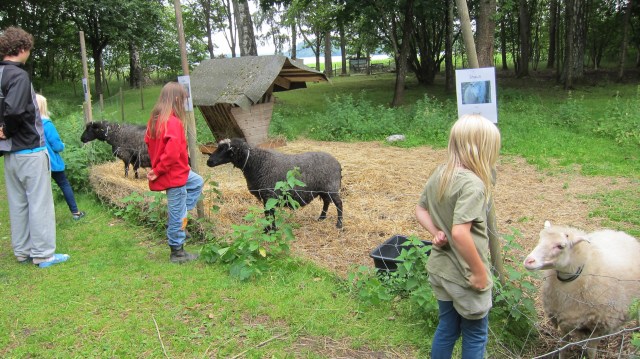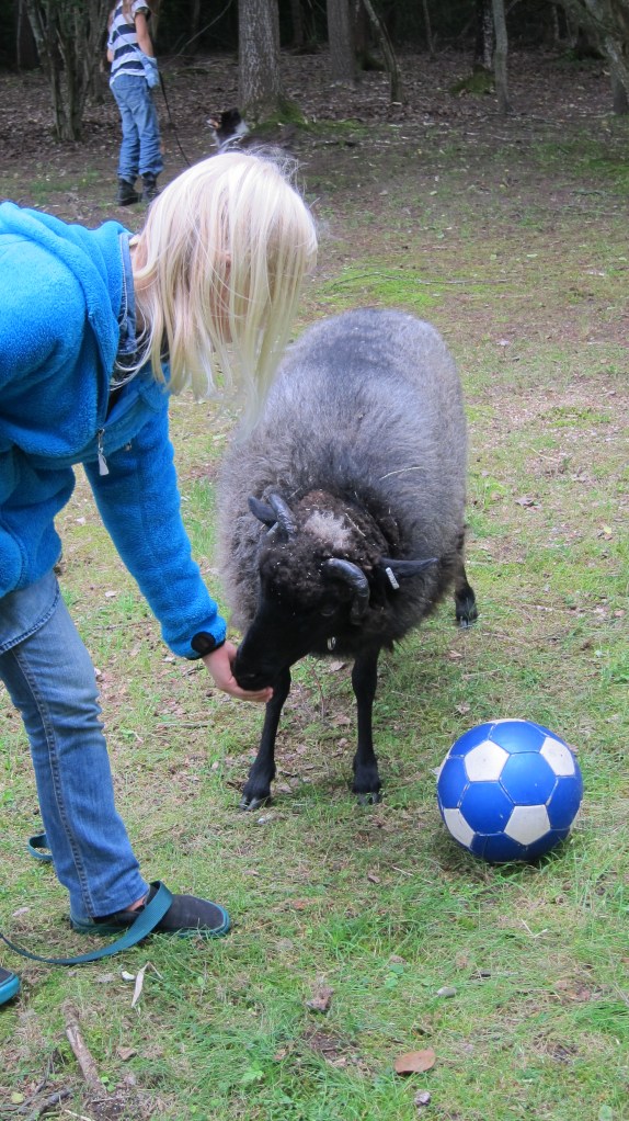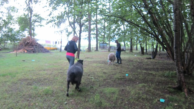Sedan gick vi ut och började träna med djuren. Ni började träna fåren utanför staketet och snart stod de på varsin plats och ni lärde dem att lyfta på sitt ben.