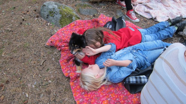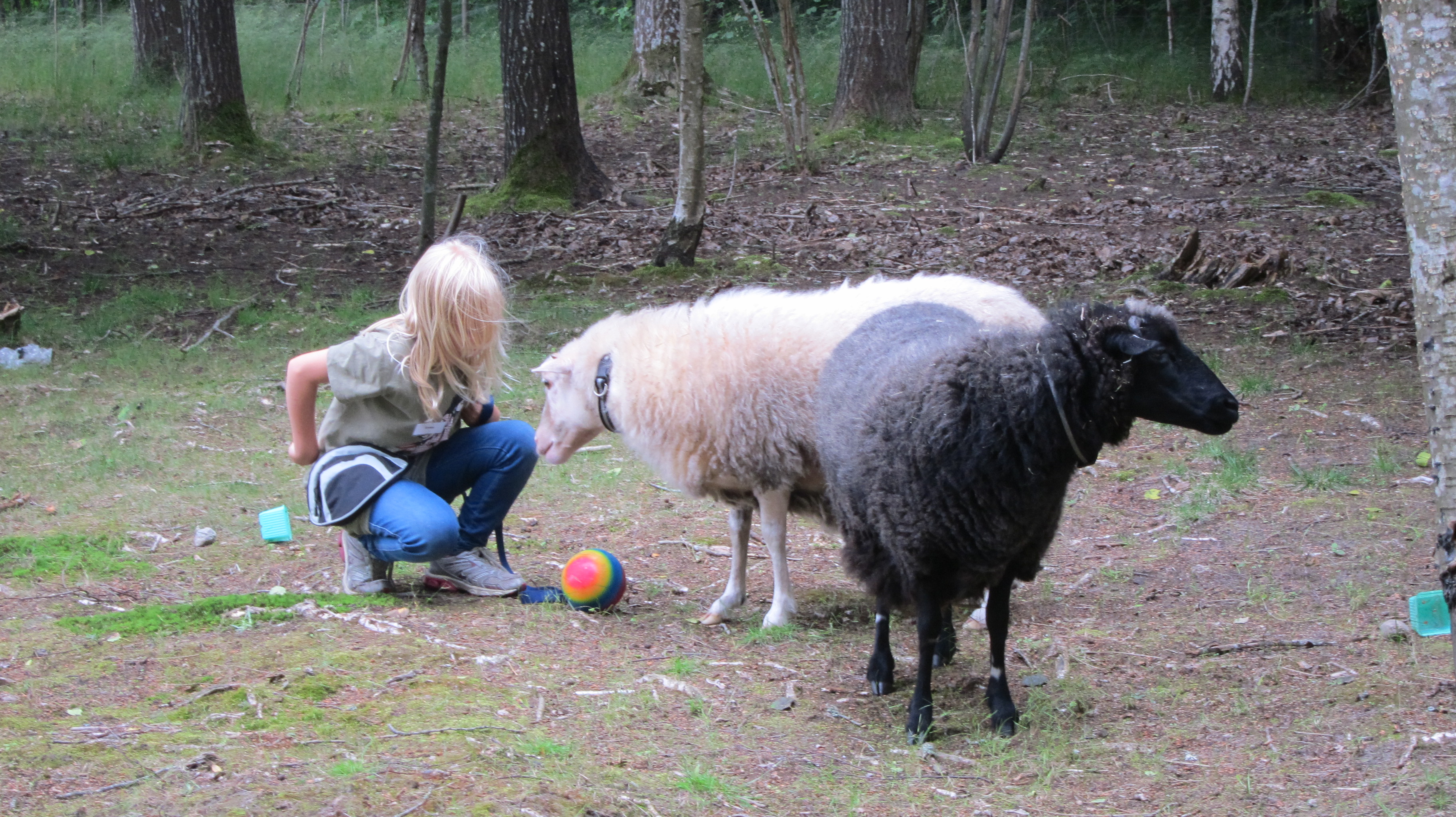 Här lekte vi ”följa John” med hundarna och fåren, vilket de tyckte var riktigt skoj.